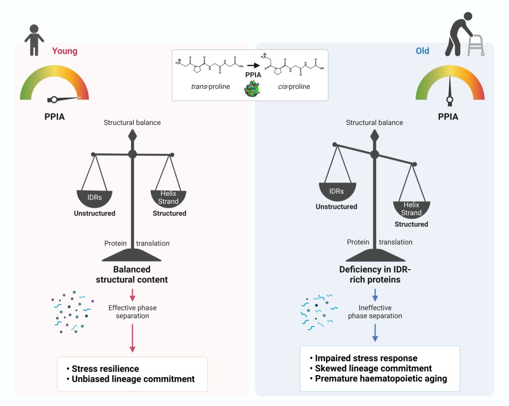 Our latest research has unveiled that the synthesis of intrinsically disordered proteins becomes a critical limiting factor as organisms age. However, blood-forming stem cells circumvent this challenge by producing elevated levels of the chaperone Cyclophilin A.